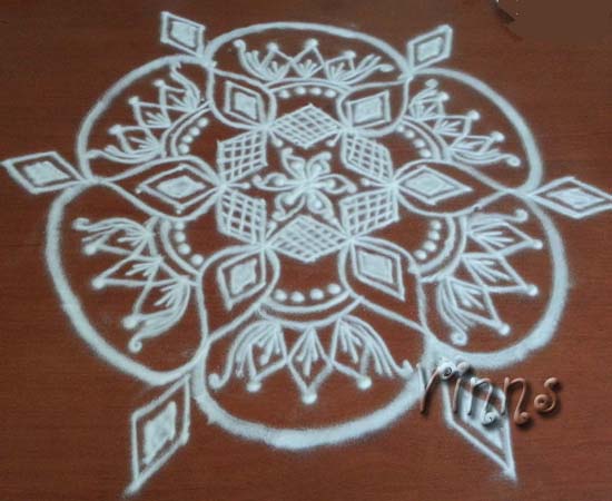 A small kolam with 5-1 interlaced kolam in the centre extended with extensions on the outer.