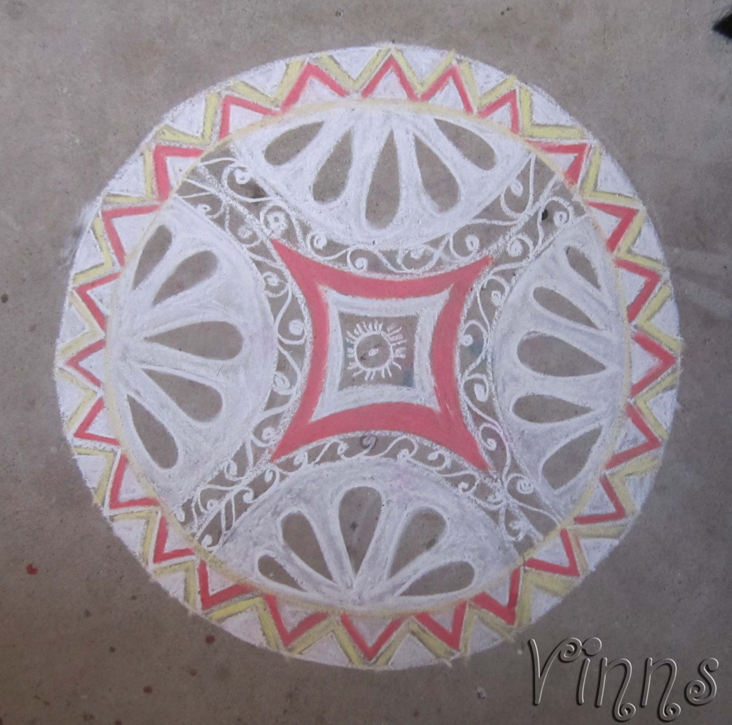 Alpona/Alpana, its how kolam is named in Eastern India. A normal Alpona is done with rice flour mixed with water either drawn by brush or with finger tip. Alpona art has motifs especially a tear drop design and free style designs incorporated within it. I haven’t seen Alpona with a dot pattern, If any one differs with my presumption, Please enlighten me.