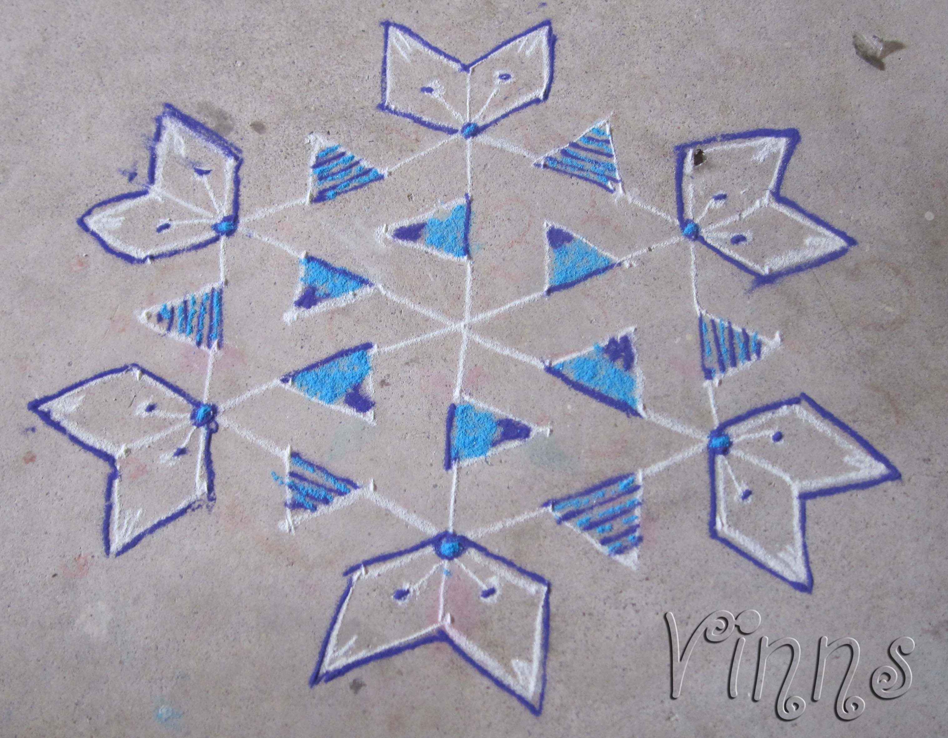 I have tried to give a different look by shading and adding some triangles into the kolam. Lovely shades of blue ๐