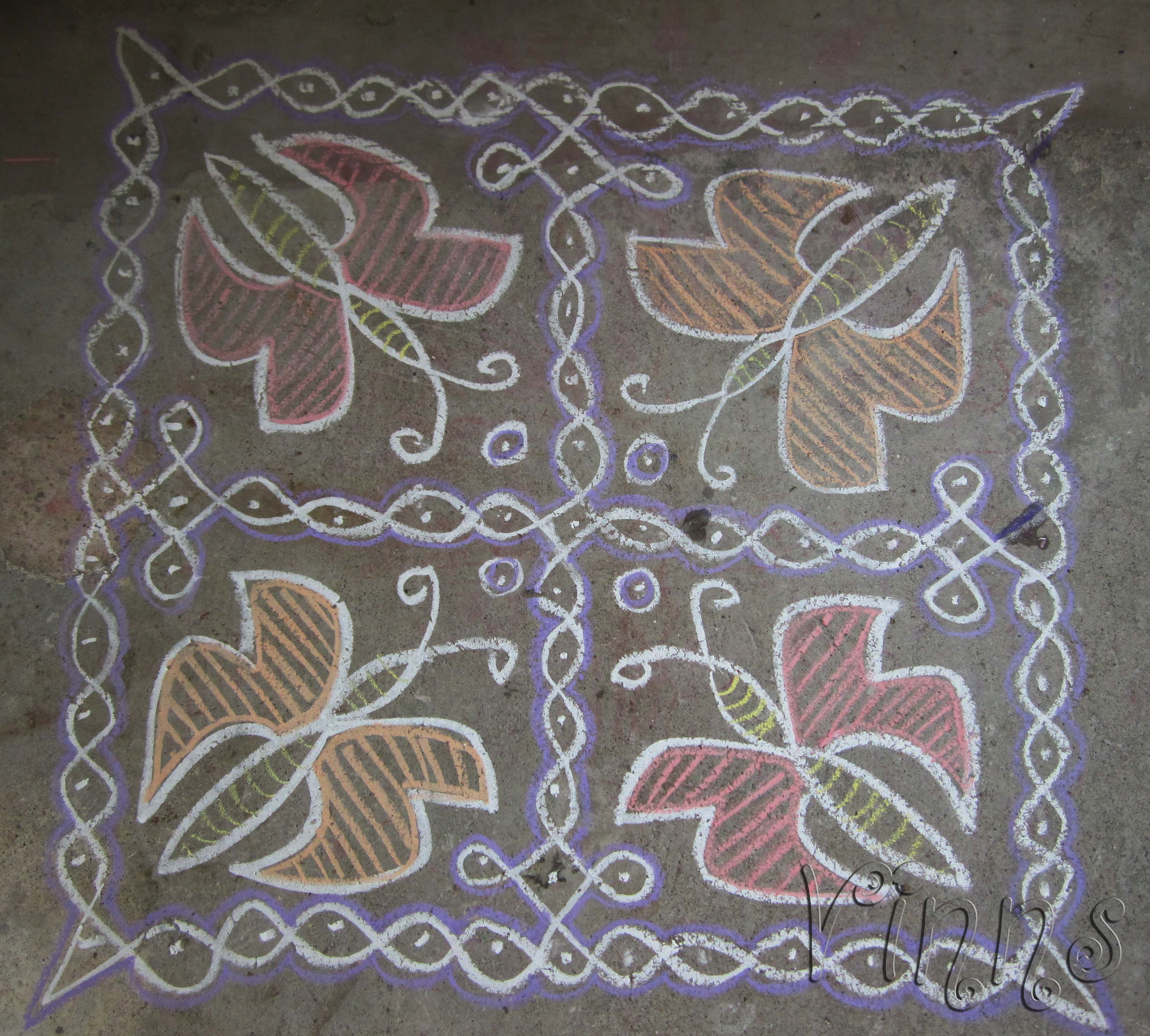 Dot KolamLine Kolam Butterfly Kolam -1 By adminvinns - November 14, 2013 0 1910 Share on Facebook Tweet on Twitter Butterflies This is 13×13 straight dot count kolam. Four coloured butterflies within the sikku strands. I haven’t done much detailing work as If felt this looked fine and didn’t experiment by adding extra elements. Hope this looks good 🙂 Butterflies
