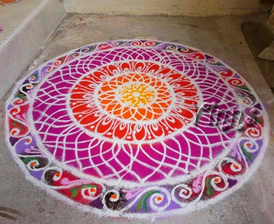 My maiden effort in sanskar bharathi style rangoli. I never attempted and always had a hesitation as the design has to be drawn on the sprinkled colours. While drawing my hand was shaky and at most lost my confidence while drawing the petals in the fourth circle 😀 Hopefully I can do with more confidence in my next attempt.