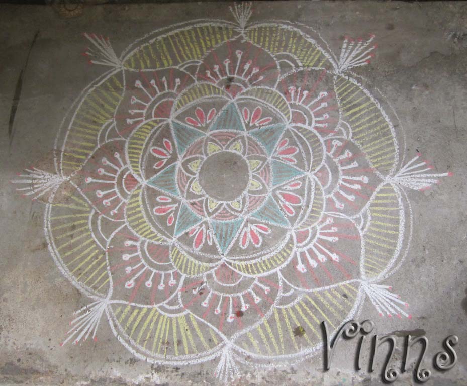 Freehand Kolam Deepavalli Kolam By adminvinns - December 6, 2013 0 1681 Share on Facebook Tweet on Twitter Deepavalli kolam A freehand kolam done in Rangoli style on a Deepavalli Day. Started with a circle and extended the design in layers with small elements inside to fill the space. I have used chalk piece to draw this kolam. Deepavalli kolam