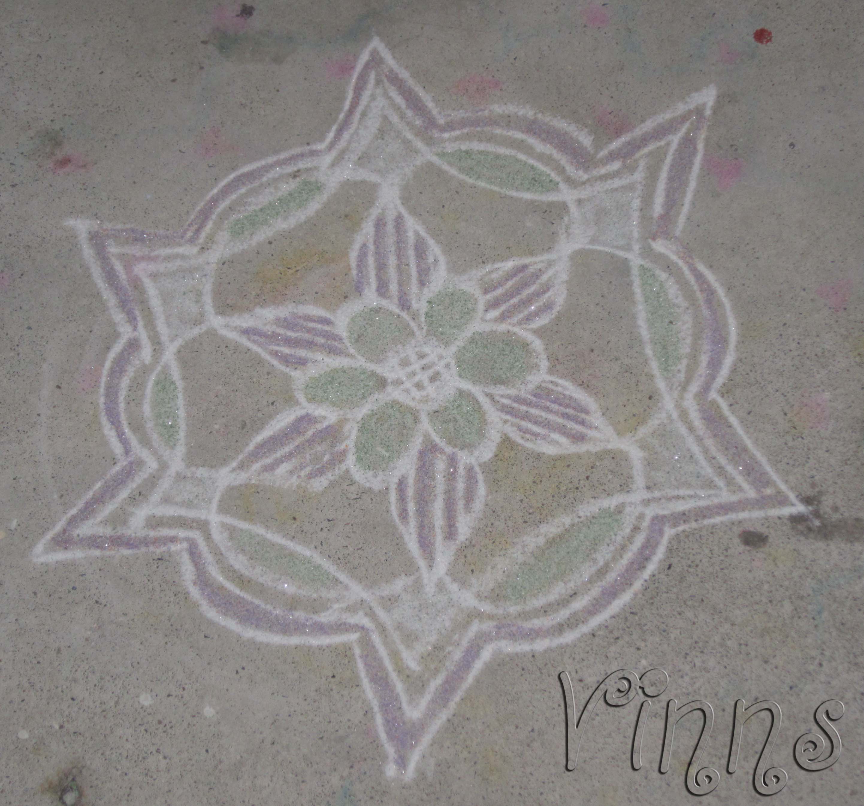 Freehand Kolam Flower Kolam By adminvinns - October 25, 2013 0 1769 Share on Facebook Tweet on Twitter Flower Design A causally drawn kolam with recycled colour powder. I like the pastel colours used in the kolam. Nothing much to say about this kolam 🙂 Pastel Shade Kolam