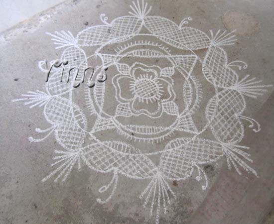 Freehand Kolam Flower Rangoli By adminvinns - December 17, 2013 0 1768 Share on Facebook Tweet on Twitter Rangoli A simple freestyle kolam done in rangoli style. With a four petal flower in the centre surrounded with hearts filled with checkers inside and fringes as the show stopper 😀 This goes into my SOTM category 🙂 Rangoli