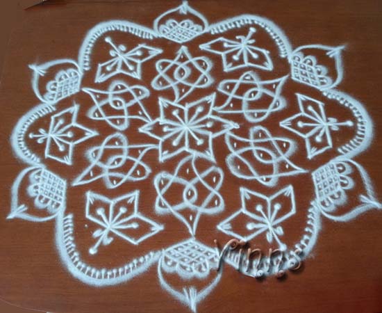 Tried this kolam which I copied from a monthly magazine. I thought of converting the sikku kolam into birds but didn’t have time (good excuse) to add some extra strokes and finished off with this display.