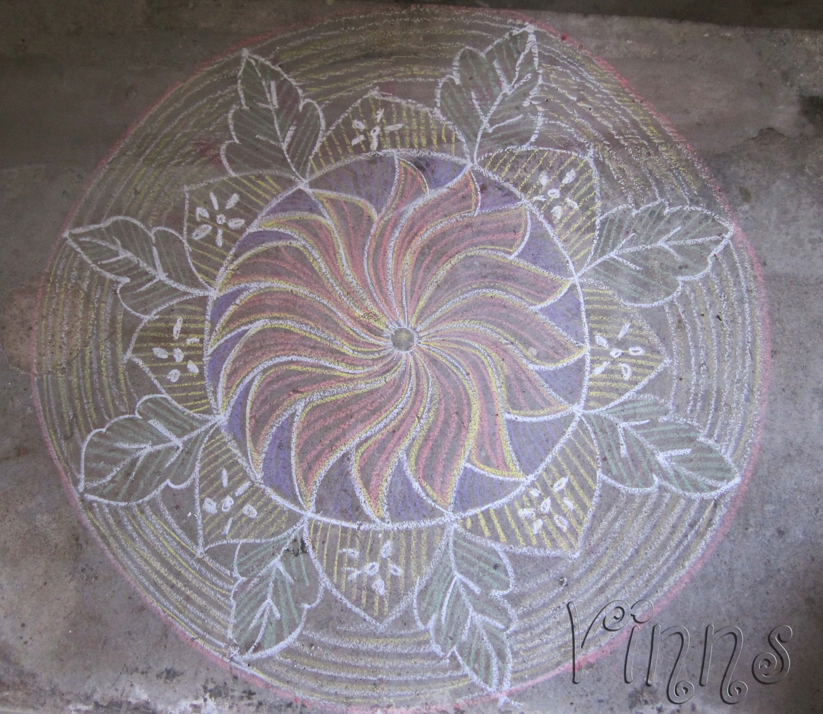 Freehand Kolam Freehand Flower Kolam By adminvinns - November 30, 2013 0 2265 Share on Facebook Tweet on Twitter Freehand Kolam A freehand kolam done in chalk piece. I have drawn a sixteen petal flower in the centre and leaves on the outer layer. To my special vision 😀 I veiw a sangu chakaram in the kolam. Can anyone spot it? Freehand Kolam
