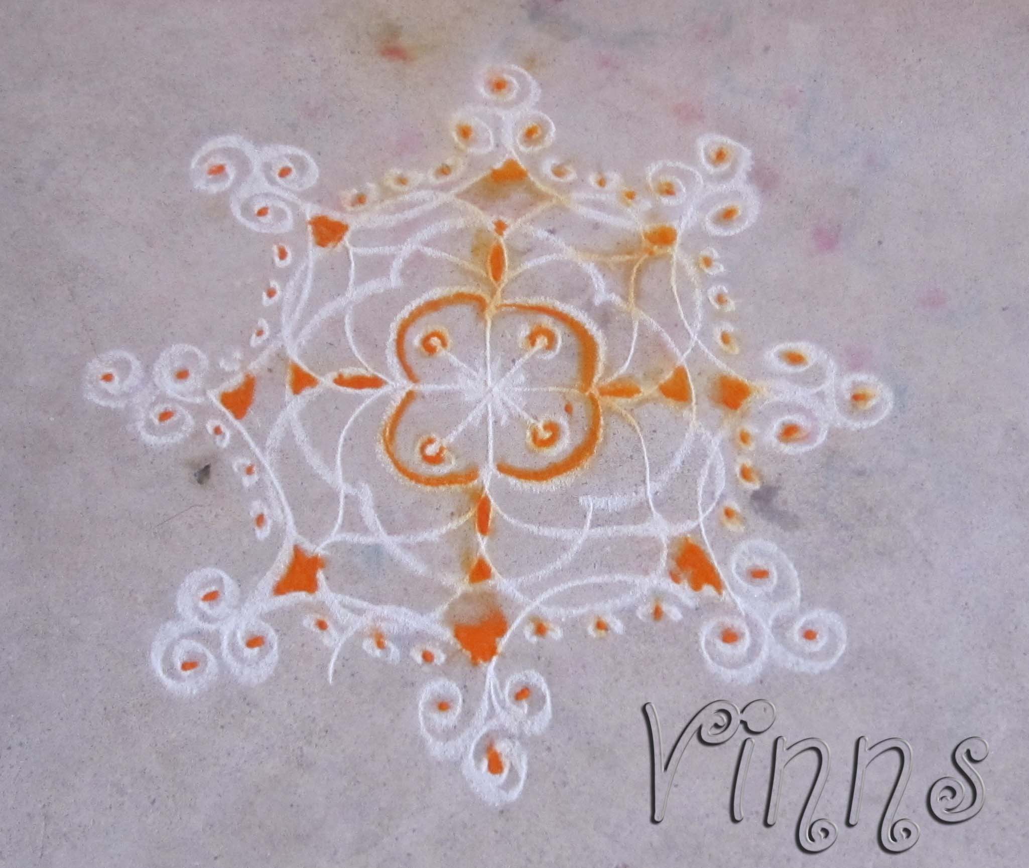 A simple freehand kolam made on floor. The colour got smudged when I was in a hurry to finish off the kolam before the floor got dried up. The remaining moisture spoiled the show. I had used food colour mixed with rice flour for the bright tangy orange colour.