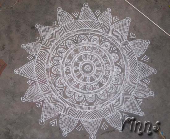 Freehand Kolam Freehand Kolam-6 By adminvinns - December 15, 2014 0 3879 Share on Facebook Tweet on Twitter Gargantuan :-) A 7 feet diameter freehand kolam, took some hours to finish this kolam. Gargantuan 🙂