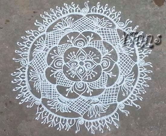 I didn’t plan for a dot kolam and proceeded with a freehand. Started with swirls and continued the same in the next layer but missed a swirl’s orientation and extended by adding lotus flowers and twirls on outer..