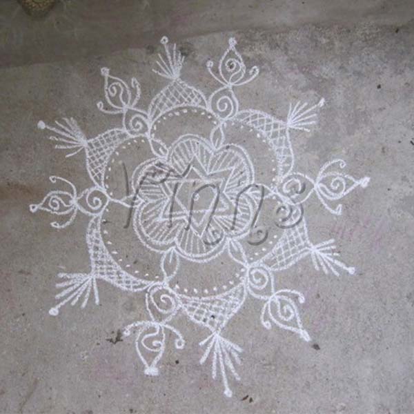 A small star freehand kolam with extensions around. I didn’t plan for a dot kolam and went ahead with a freehand. Took a minute to decide the basic/centre design. Then decided with a twinkle star at the centre and proceeded the design by adding border lines,question marks and fringes on the outer layer.