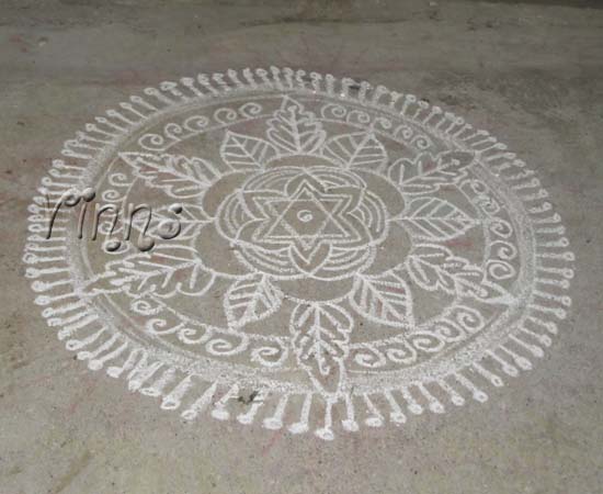 I started this kolam with star at the centre and didn’t know how to proceed :-D, So added some leaves on the border and round edged spikes for the final touch 🙂
