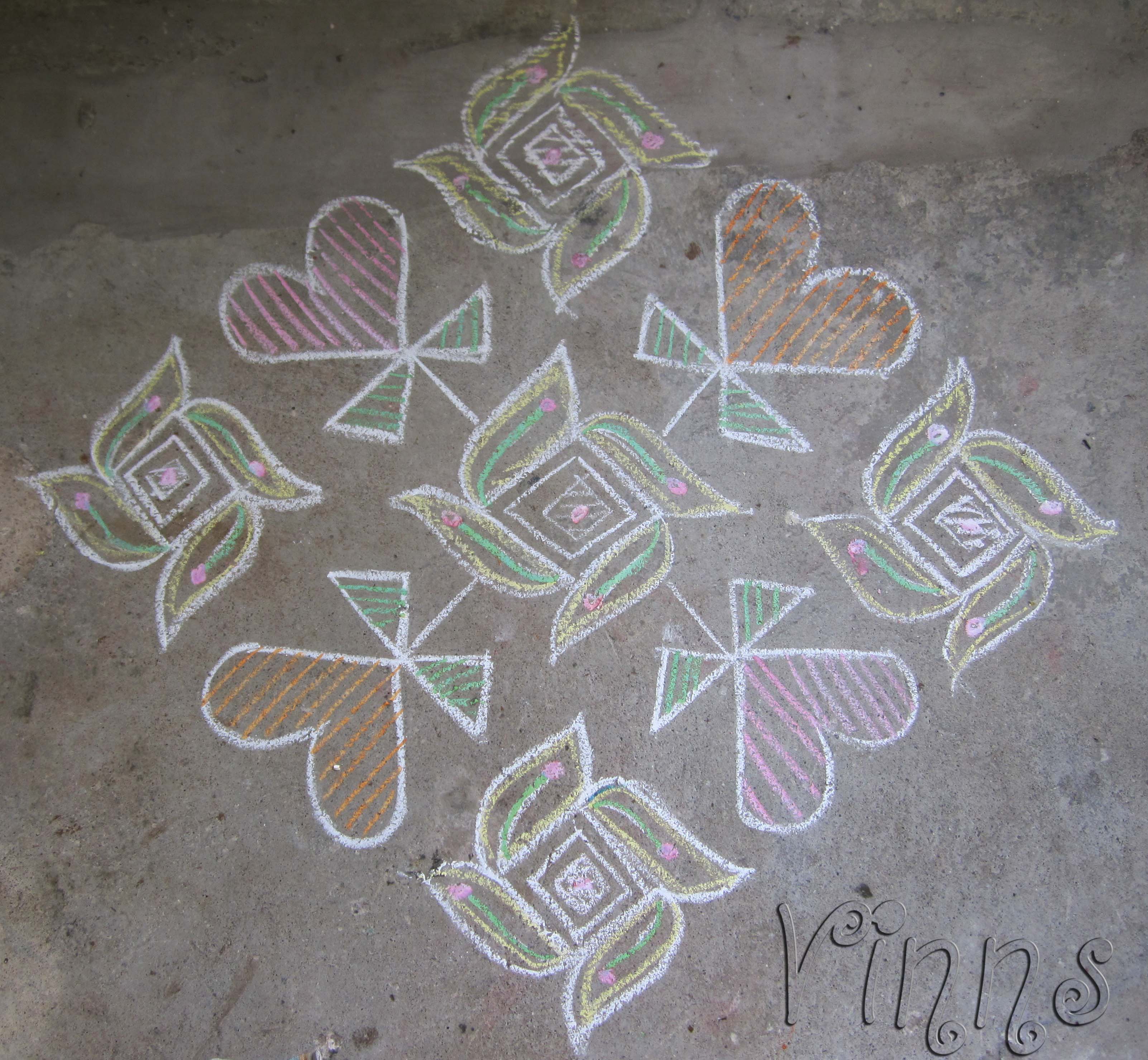 This is a 15-1 dot count kolam with hearts and pin wheels.