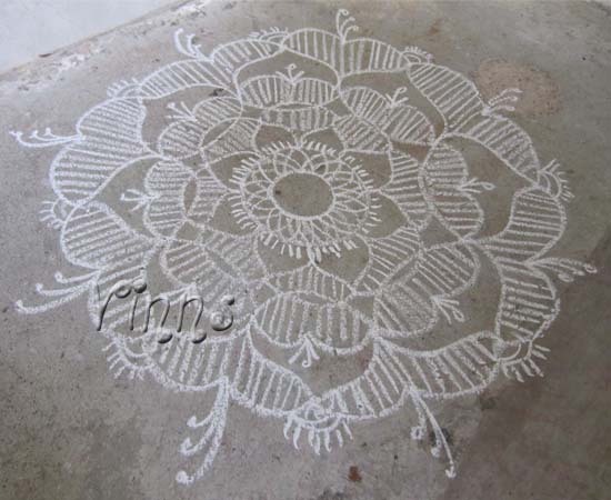 I’m uploading a simple freehand kolam done in a circle pattern. I kept on extending the design with heart shapes and filling with lines. Nothing special in this kolam except for smiling hearts πŸ™‚