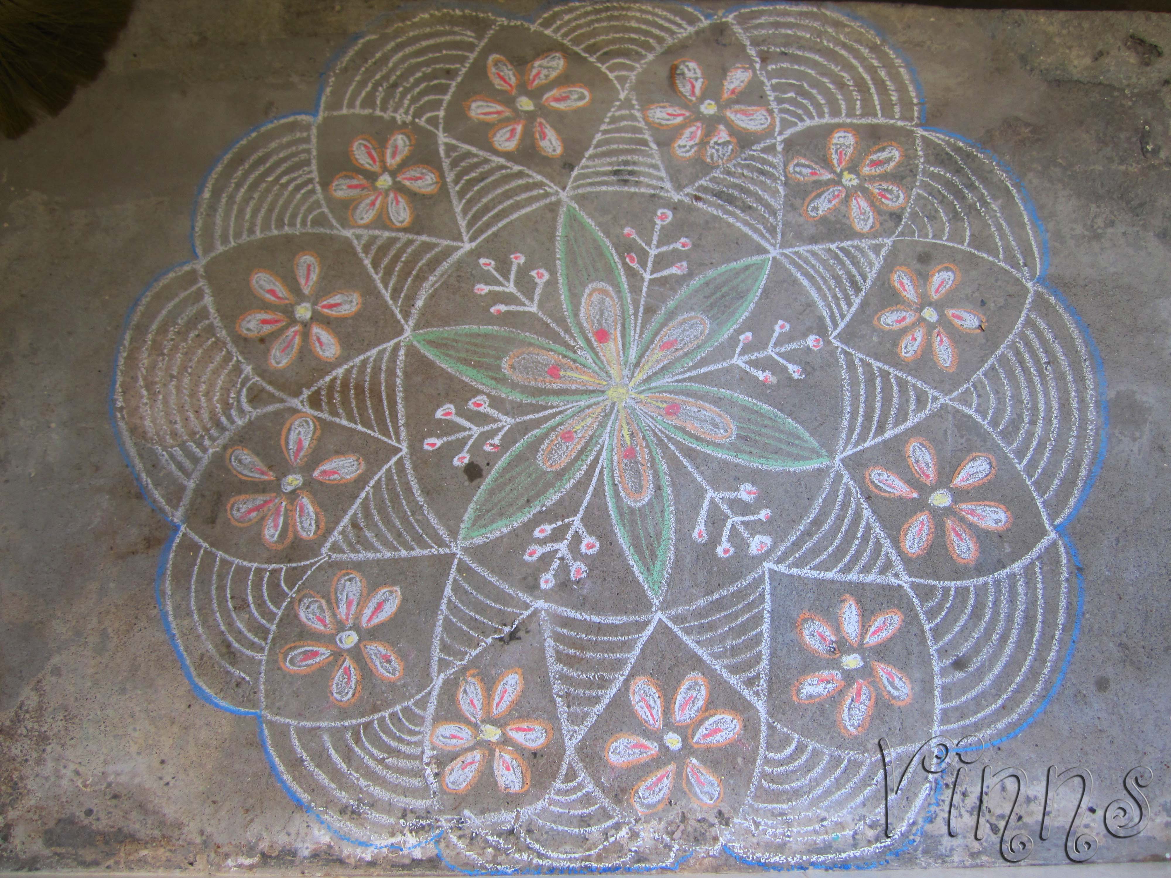 A circular type freehand kolam done with chalk piece.