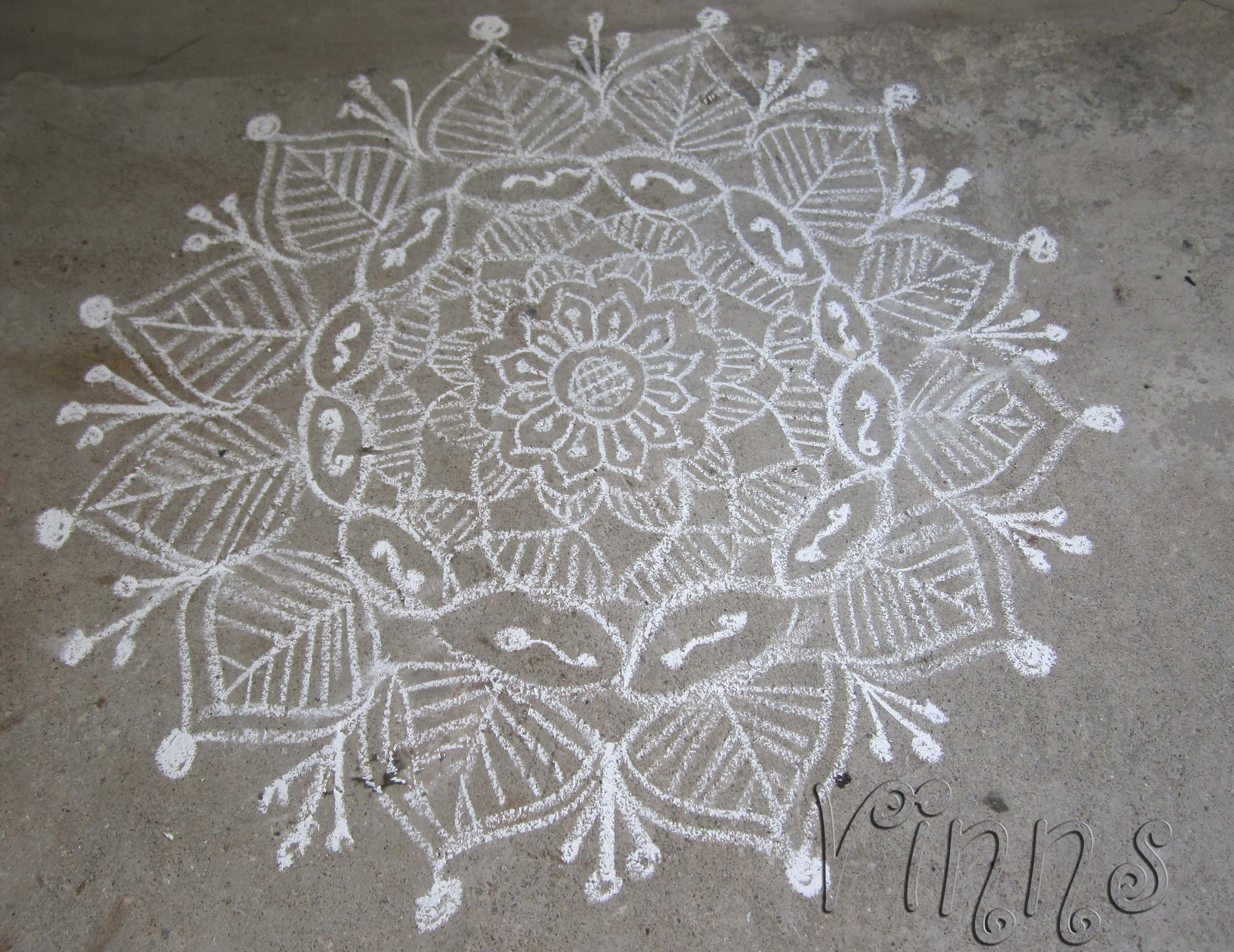 A causally drawn freestyle kolam. If its a freestyle, I usually start with a flower design in the centre and extend with extra designs. This kolam has 12 petal flower at the centre with extra petals around and leaves on the outer layer for a finishing touch.