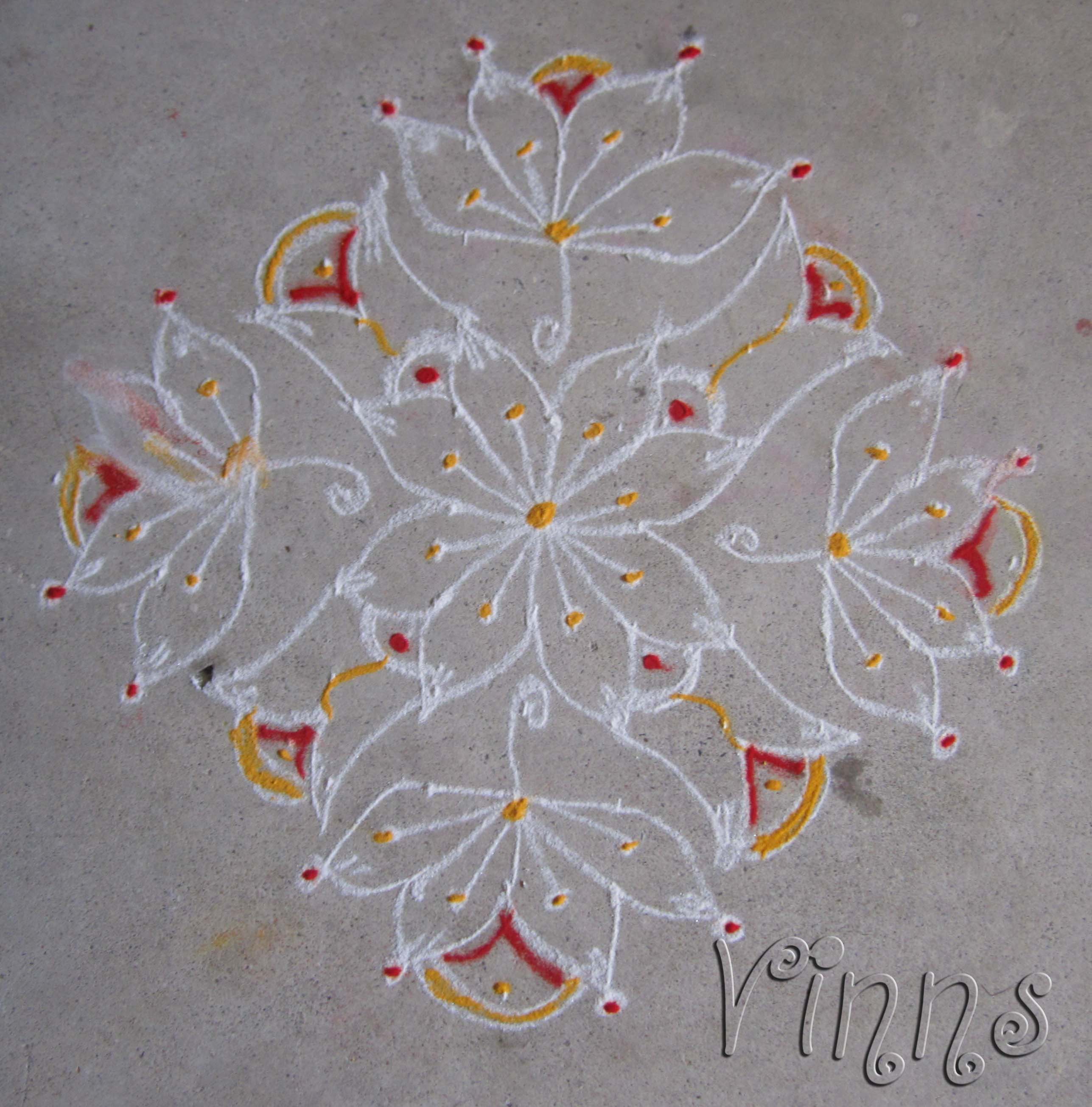 Dot KolamLine Kolam Red And Yellow Kolam By adminvinns - October 30, 2013 0 2615 Share on Facebook Tweet on Twitter Flower and Buds This is 11×1 straight dot count kolam. A common kolam. This kolam has a eight petaled flower in the centre with the buds on the outer and To give a final touch, I added yellow and red to this kolam.Flower and Buds