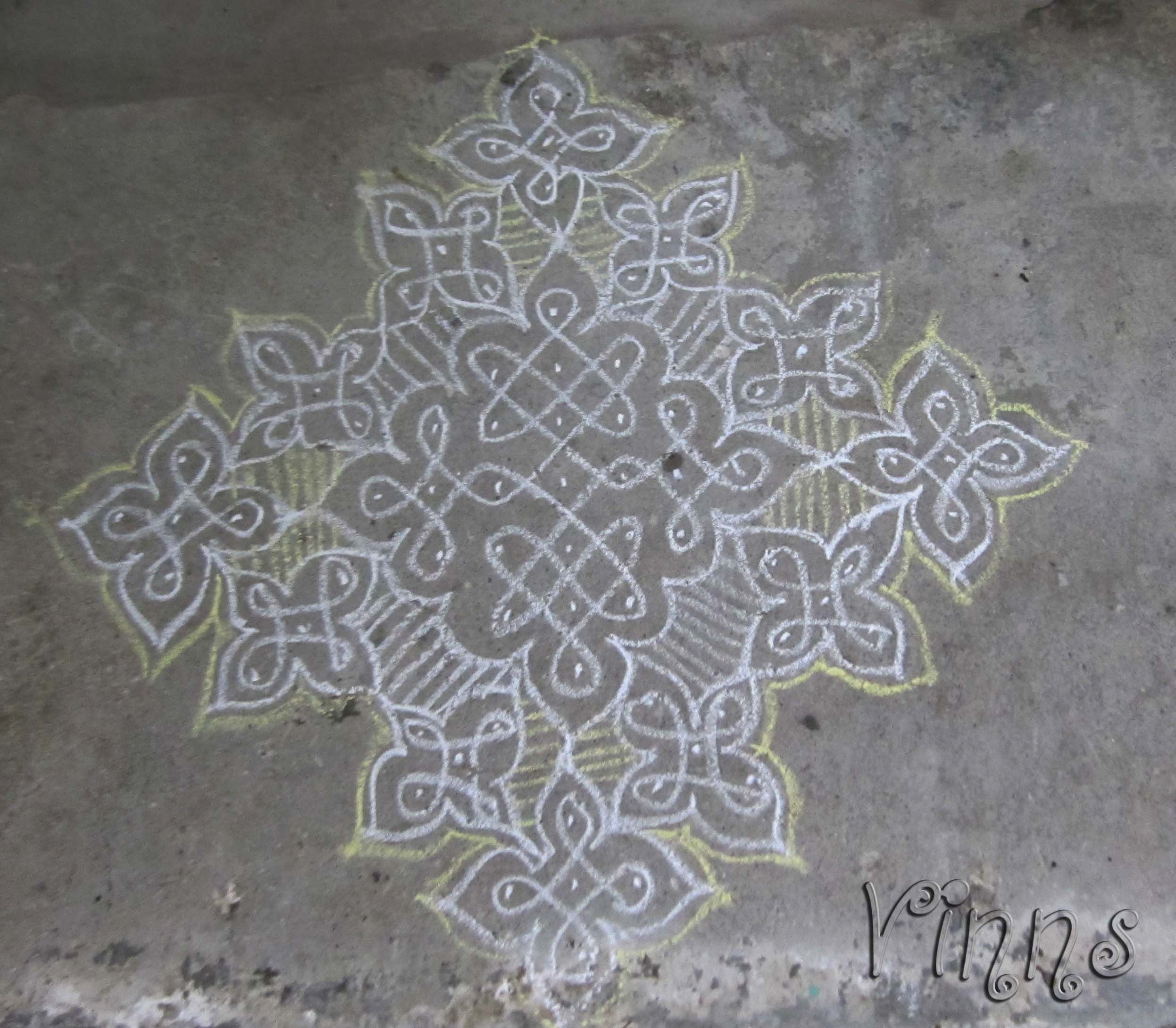 This is kolam was a spur of the moment, as I usually don’t preplan before drawing.. The first line or dot decides the genre and design of the kolam. After finishing a kolam I take a resolution to prepare and rehearse before starting a kolam 🙂 but never adhered to the objective of drawing a kolam 🙂 In this kolam I have used white and yellow colour chalk piece to draw.