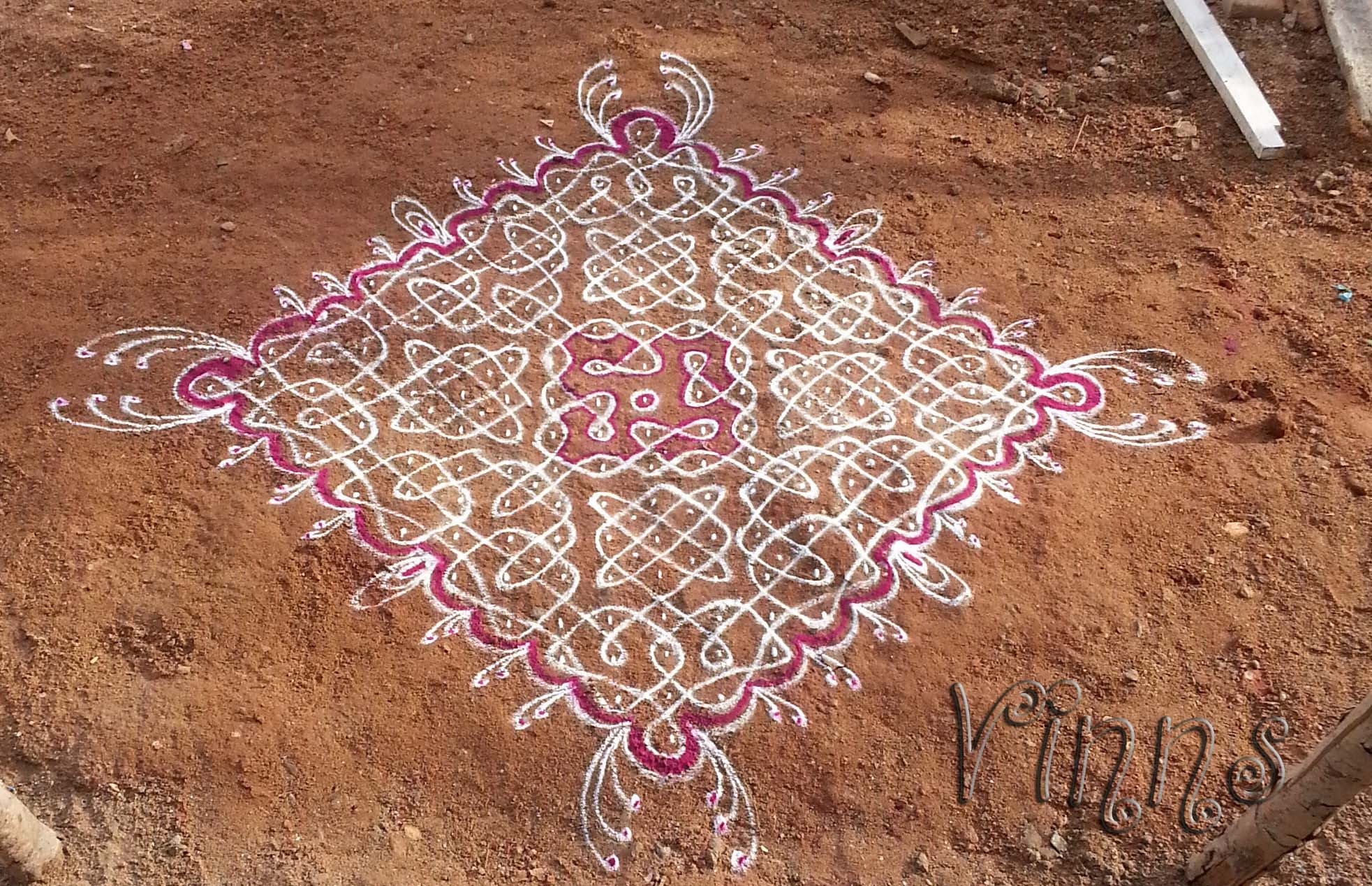 This sikku kolam was done at my mother’s new home when I visited this June. The red soil mud floor enchanted me to draw bigger kolams π My mother witnessed my work with a smug look (too proud of her daughter), my Dad took over the supply of materials delivered at time π He bought me new colours and kola podi when the kolapodi was out of stock.
