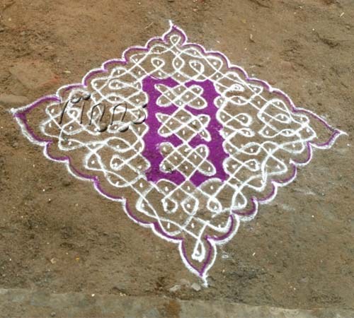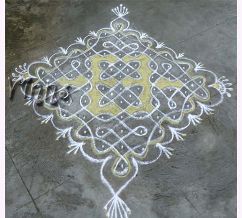 A sikku kolam with 12 dots placed in straight pattern which can be drawn in any even number dot count right from 6 dots. When time permits I’ll try to upload the 14×2 dot version. This design is deep in my memory, so whenever I’m lazy to recollect complicated sikku kolams, I go with this version. I have added yellow colour for enhancement. Hope it looks good:-)