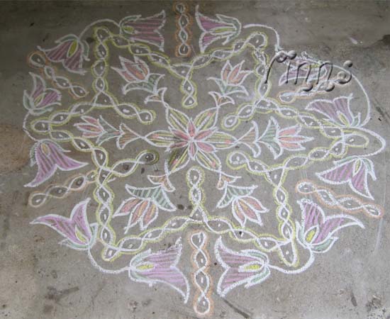Dot KolamSikku kolam Sikku Kolam -23 By adminvinns - December 16, 2013 0 2360 Share on Facebook Tweet on Twitter Flower Sikku kolam A 15-9 dotted kolam with interlaced pattern. I liked this kolam for the sikku strand forming a star shape around the centre flower. Tried my level best to cover up the mistakes done 😀 but its still prominently seen in the display. Flower Sikku kolam
