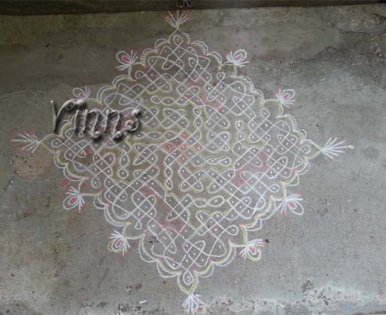Dot KolamSikku kolam Sikku Kolam -34 By adminvinns - December 29, 2013 0 2447 Share on Facebook Tweet on Twitter Sikku kolam A 19 Dot sikku kolam done today. Each side has three strands and the middle with three lines, a simple one to draw :-). I have tried to beautify the kolam with border and fringes on the outer. Hope they look good. Sikku kolam