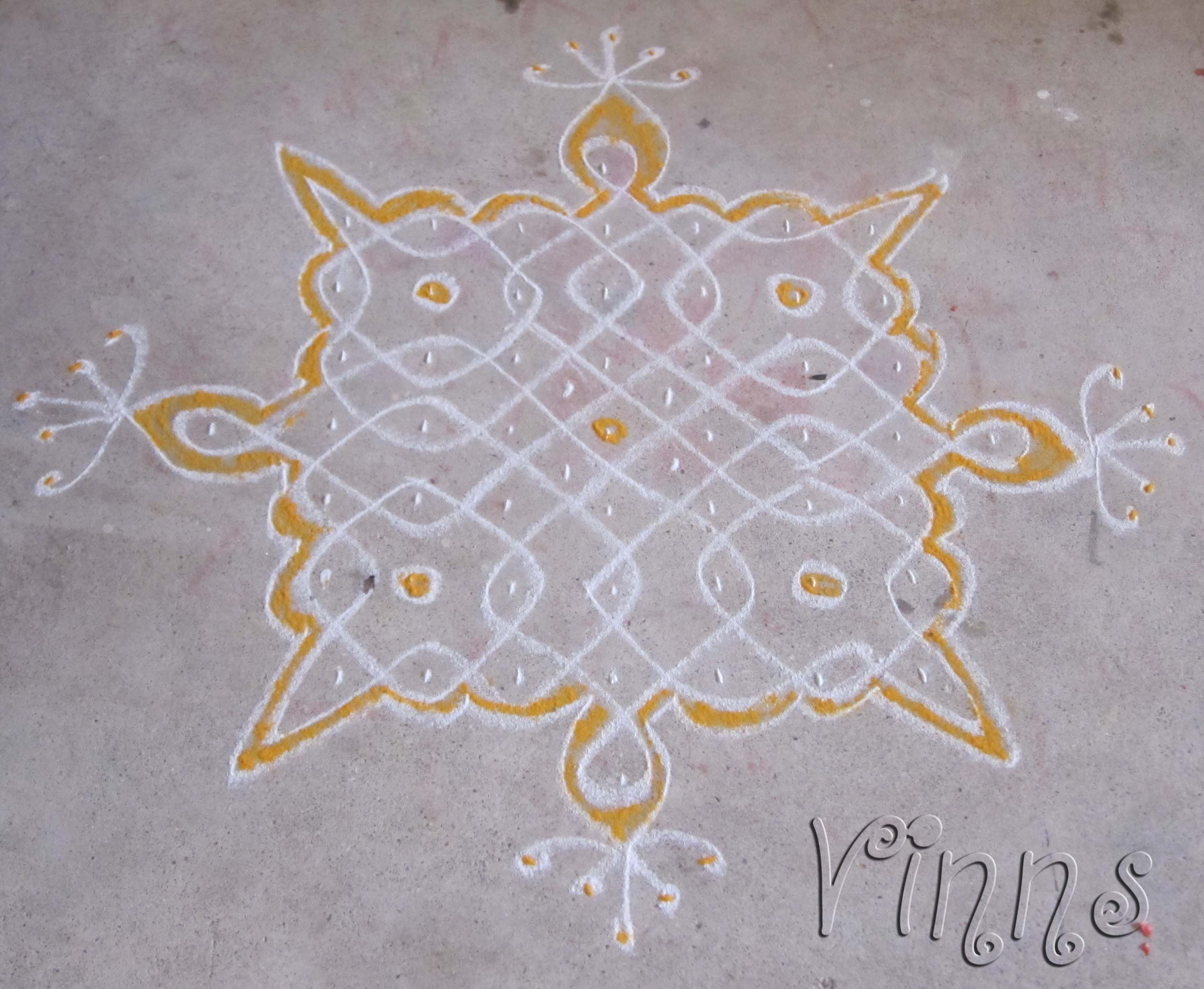 Dot KolamSikku kolam Sikku Kolam-5 By adminvinns - October 27, 2013 0 2036 Share on Facebook Tweet on Twitter Sikku kolam A small sikku kolam done with kola podi and outlined with yellow colour. Dot count :9×1,7×3,1 Sikku kolam