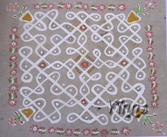 Dot KolamSikku kolam Sikku Kolam – 58 By adminvinns - February 4, 2014 0 2779 Share on Facebook Tweet on Twitter Square Kolam A 9×9 dots sikku kolam done with wet rice paste. I have added extra designs for enhancement 🙂 Square Kolam