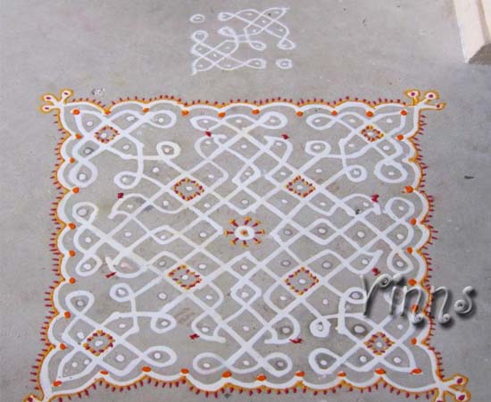 I extended the base design with 4×4 dot count seen on the top of the image into 9×9 sikku kolam. I have linked all the dots in the kolam as I don’t like to leave a dot aloof from the main kolam. I always make sure to have all dots linked and gets along with the kolam. I make my level best that all dots are utilised in making of the kolam