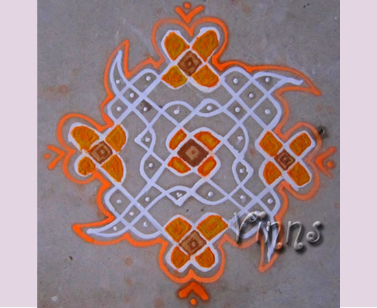 I need to elaborate the colours used in this kolam. Before to that, this kolam is always a saver when I go blank at the time of drawing kolam on the entrance. This kolam is well etched in memory as I have seen this kolam drawn by my mother frequently in childhood days. The centre design can be drawn as an individual kolam with a dot count of 4×4.