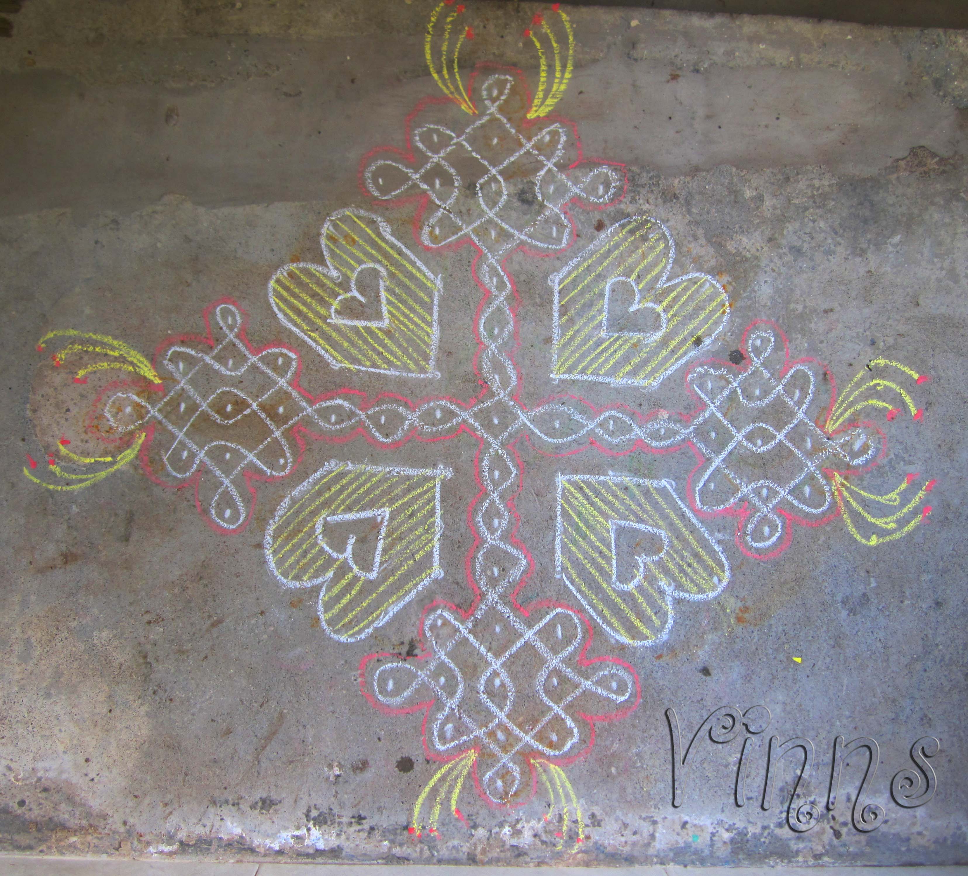 This is a 15-1 dot straight pattern kolam. A simple 5-1 sikku kolams are connected with others and the extra dots are filled with hearts enclosed in protective capsules π 15 dots Sikku Kolam.. A simple and easy to draw kolam. I like this kolam for its simple sikku strand running through, no tangles, a single line though. This Kolam has 5 dots kolam as the the base and drawn on four sides interconnected with a single sikku strand. I have used chalk piece and colours for enhancement.