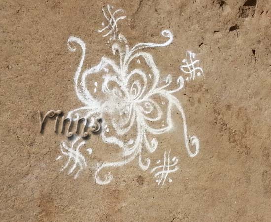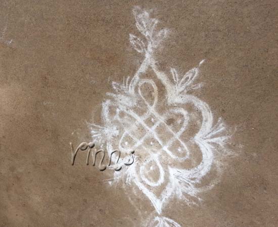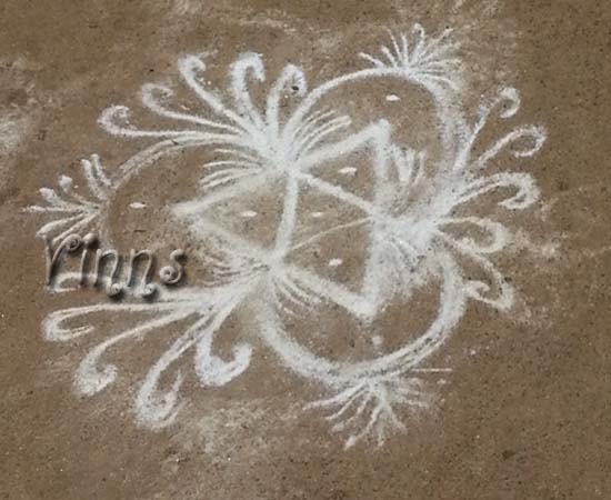 The kolams uploaded in this page were done by one of my cousins who is good in making freehand rangolis. She sticks on to small freestyle as she is bit lazy in placing the dots and I guess 4 dots kolam is the maximum dot count she has tried ever :-D. I have insisted her to draw a dot ones, she replies me with a smile. I like the way she adds the extra details which elevates the beauty of the kolam.