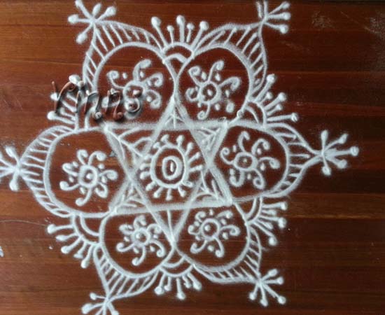 Freehand Kolam Small Rangoli -2 By adminvinns - January 6, 2014 0 4718 Share on Facebook Tweet on Twitter Star Kolam Two small rangoli type kolams done on a table. As usual without any preparation I started with a centre design and extended with some designs. Star Kolam Small Flower Kolam
