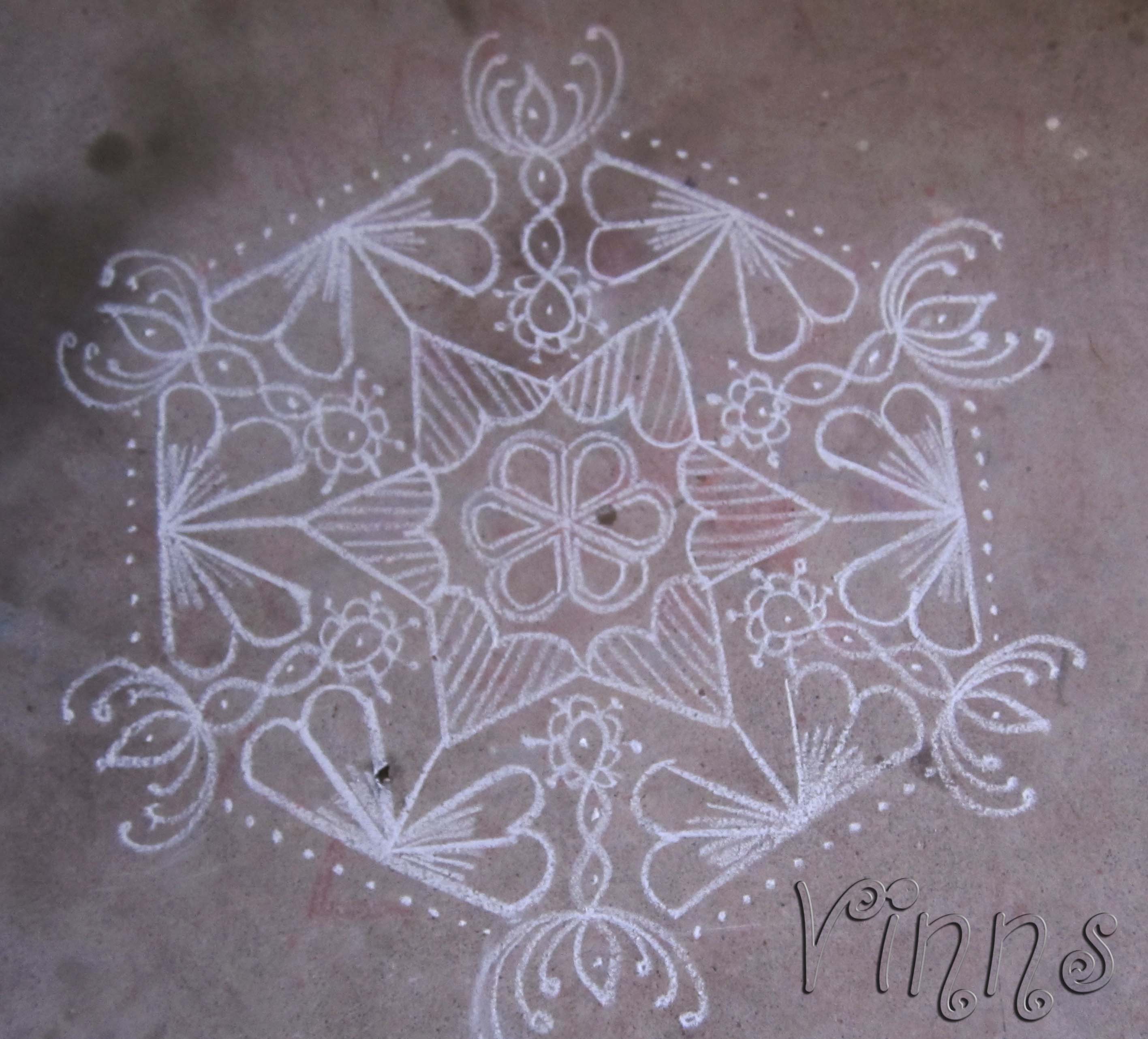 Over make up ruins the show LOL. I did the same thing to this kolam. I should have stopped drawing the main elements and no further experiment with frills and curls on the sikku strand. I feel those look out of place. I like this kolam particularly for the evenly placed dots. I don’t feel comfortable in placing the interlaced dots. My maiden effort in intermediate dot count and I’m pleased with the final result 🙂