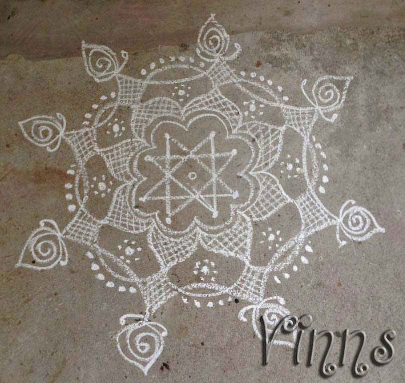 Freehand Kolam Star Kolam with swirls By adminvinns - December 4, 2013 0 2581 Share on Facebook Tweet on Twitter Star kolam with swirls A simple kolam with star as the basic design. To make the kolam look better, I added some curves and, dots and swirls filled the spaces with crossed lines. Hope you like 🙂 Star kolam with swirls