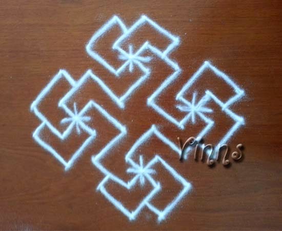 Dot KolamLine Kolam Swastik Kolam -3 By adminvinns - March 28, 2014 0 11427 Share on Facebook Tweet on Twitter Swastiks A small swastik kolam with 8×2-2 dots placed in straight pattern. Swastiks