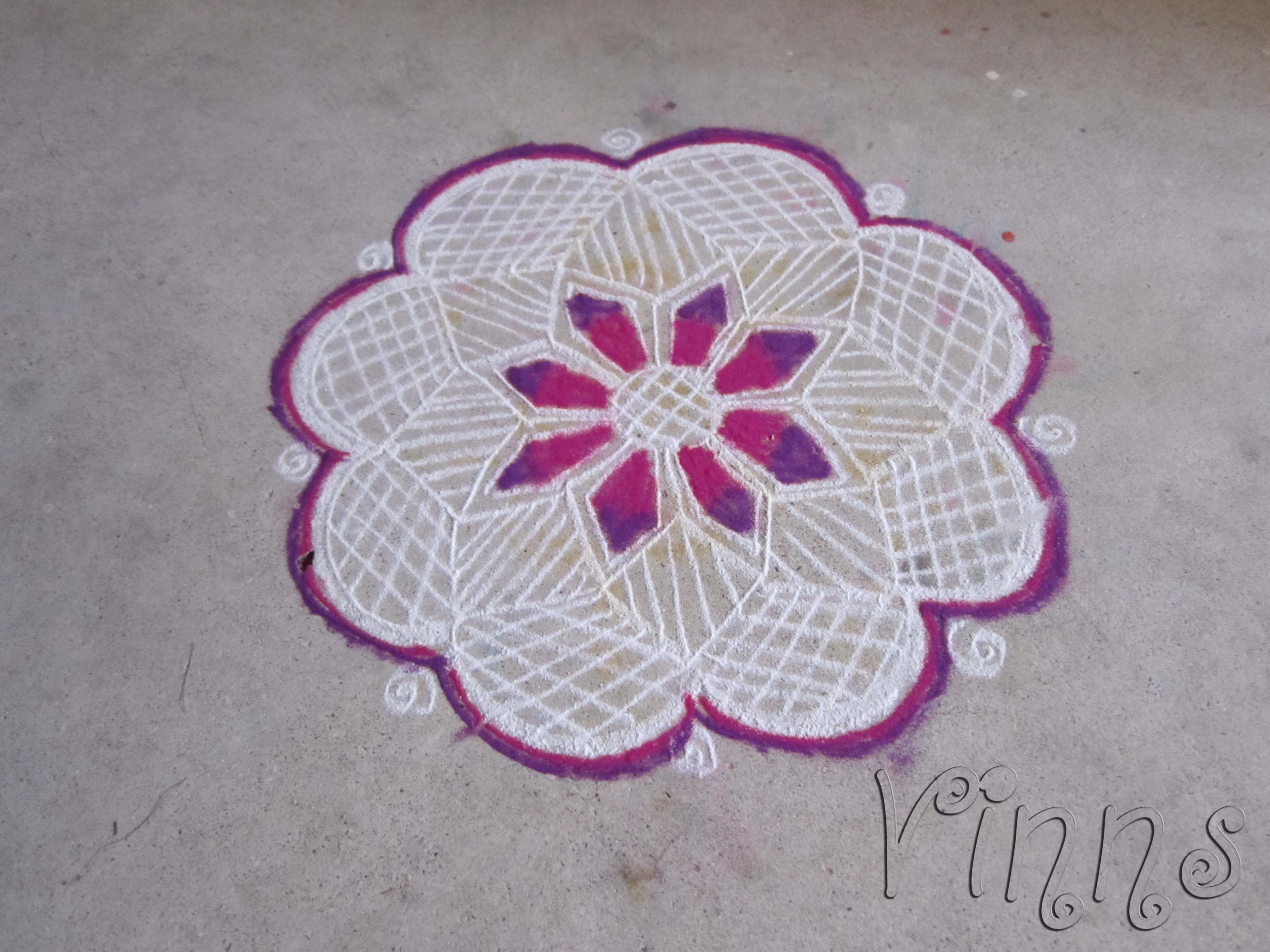 Freehand Kolam Violet Flower Kolam – Small Kolam By adminvinns - October 30, 2013 0 1423 Share on Facebook Tweet on Twitter Stripes and Crosses A causally drawn kolam without much detailing done. I wasn’t satisfied about the outcome, still added some violet shades to make appealing, Hope so 🙂 I tried using two colours in this small kolam. Stripes and Crosses